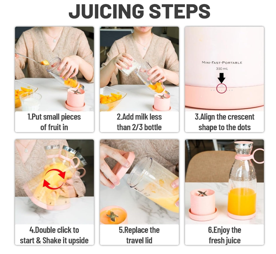 Add fruit and liquid, align and close, double-click to blend, shake, and enjoy fresh juice in seconds.